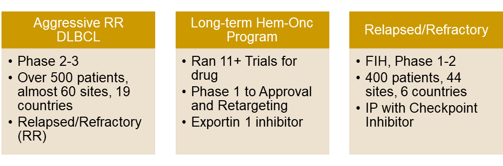 The majority of Precision’s work in Non-Hodgkin’s Lymphoma has been in the early phase setting. We have been honored to have a role in these fundamental trials that laid the groundwork for larger scale studies, and we have supported several of those later phase NHL trials.