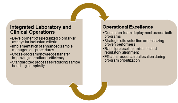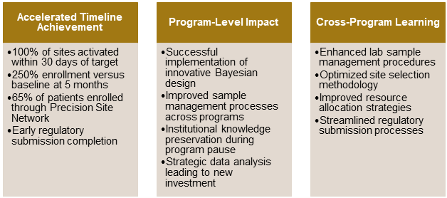 The programs demanded specialized biomarker assessment, complex sample management, and innovative trial design approaches. When financial constraints required temporarily pausing one program, maintaining momentum while preserving institutional knowledge became critical.