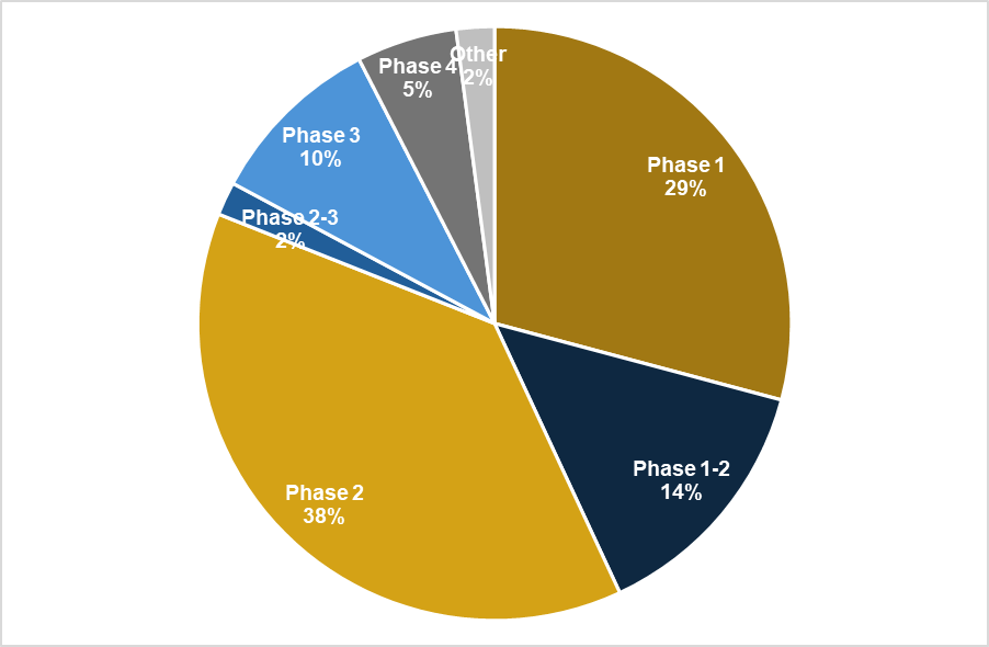 Each phase of a radiopharmaceutical clinical trial has a purpose in deducing drug safety, efficacy, and dosage. These data pinpoint a significant number of trials in early development with over 80% of trials in Phase 1, Phase 1-2, or Phase 2.
