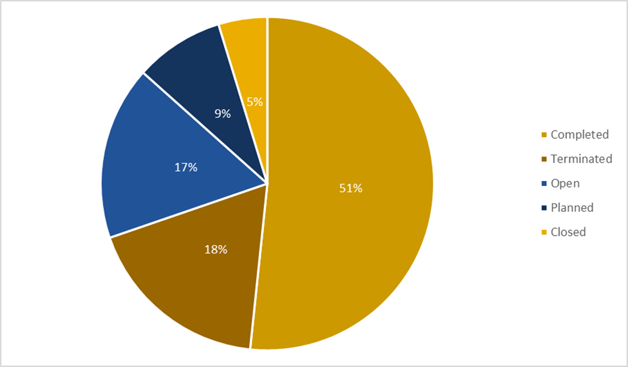 To date, there have been over 11,300 Late Phase Oncology trials. Just over 1900 are open and 981 are planned. Here is a breakdown by status.