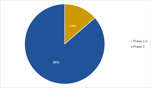 Late-phase oncology trials encompass both Phase 2-3 and Phase 3 studies, with the latter now being the more prevalent model. This split underscores the prioritization of robust, large-scale data collection needed to support regulatory approvals and establish the therapeutic value of new oncology treatments.