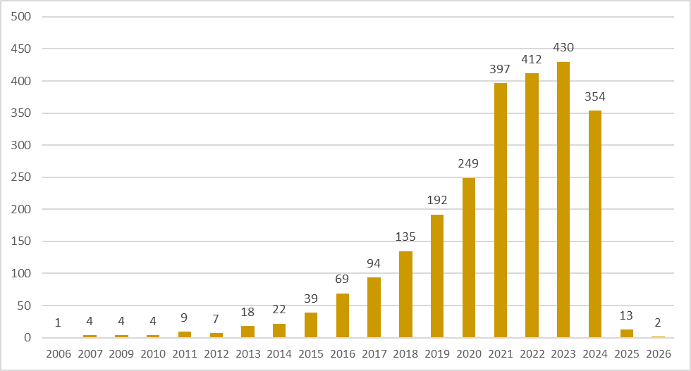 Over recent years, we have seen a significant rise in clinical trial activity in Non-Hodgkin’s Lymphoma as evidenced by the rapid increase in new studies launched annually. The data below provides a visualization of the planned and ongoing NHL trials by start date.