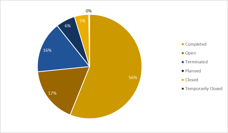 China, followed closely by the United States, leads the field in quantity of NHL trials. Of the 2,675 ongoing trials, China participates in 46.6% and the US in 34.1%. From the table below, we can see that sites are spread around the world.